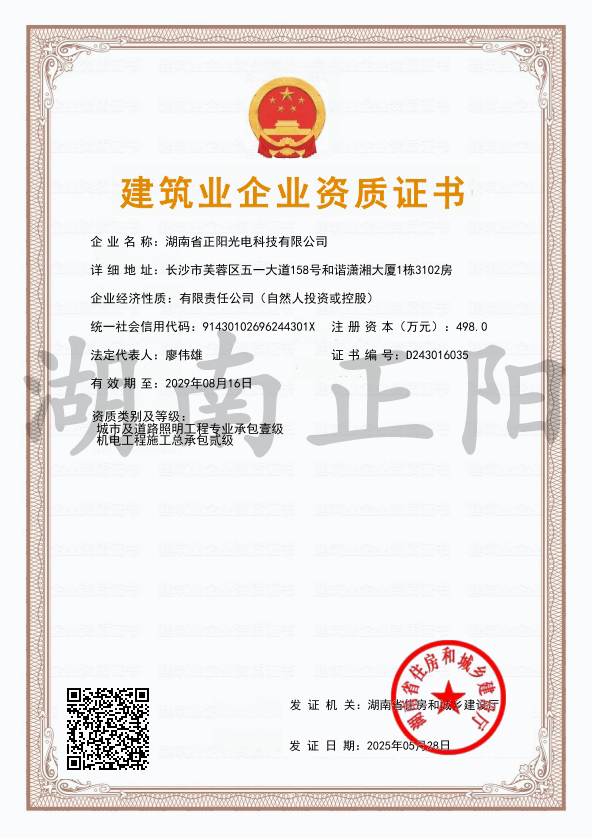 湖南省正陽(yáng)光電科技有限公司是一家從事亮化工程及大型燈光藝術(shù)的設(shè)計(jì)、制作、安裝和維護(hù)于一體的專(zhuān)業(yè)化公司。公司資質(zhì)齊全、管理嚴(yán)謹(jǐn)、技術(shù)先進(jìn)、實(shí)力雄厚,取得了城市及道路照明工程專(zhuān)業(yè)承包壹級(jí)資質(zhì)、照明工程設(shè)計(jì)專(zhuān)項(xiàng)甲級(jí)資質(zhì)、國(guó)家高新技術(shù)企業(yè)、國(guó)家“重質(zhì)量·守誠(chéng)信”示范企業(yè)。
